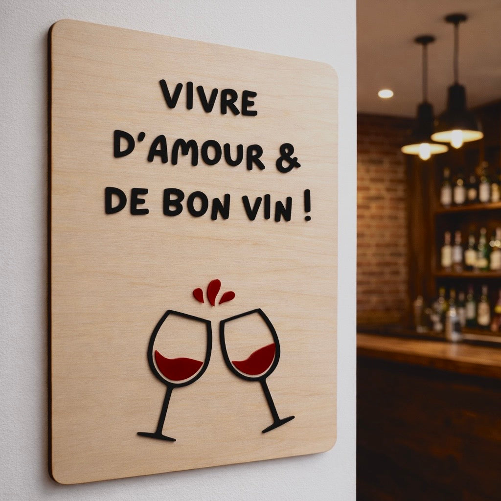 - Décoration en bois avec texte en plexi "vivre d'amour et de bon vin"